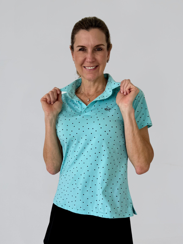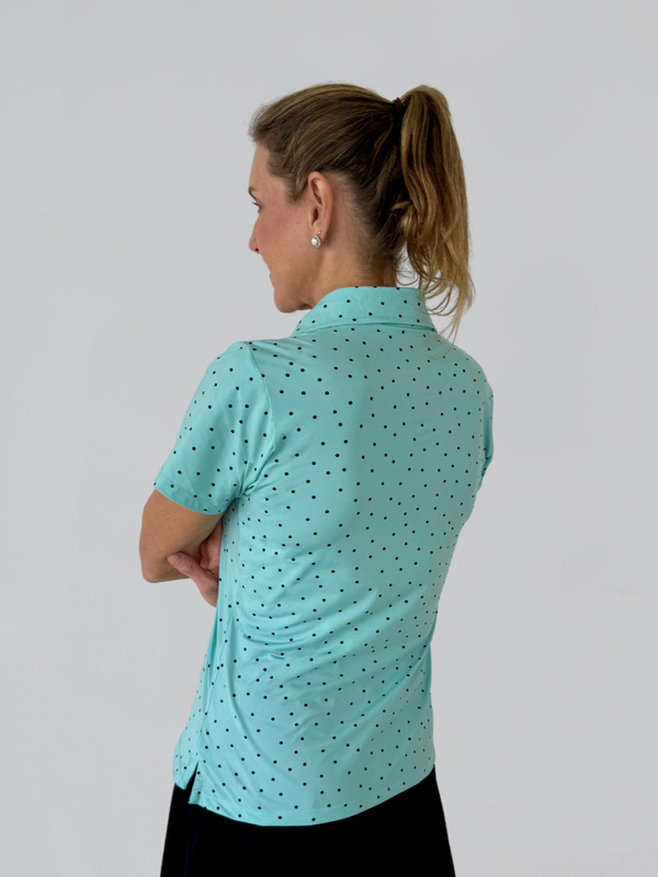 Blusa manga corta estilo polo en negro con pepas blancas, cuello y sin botones. Confeccionada con ajuste medio a la silueta en tela muy suave y elástica ofreciendo una sensación natural y muy cómoda permitiendo libertad de movimientos. Textil de alto desempeño.