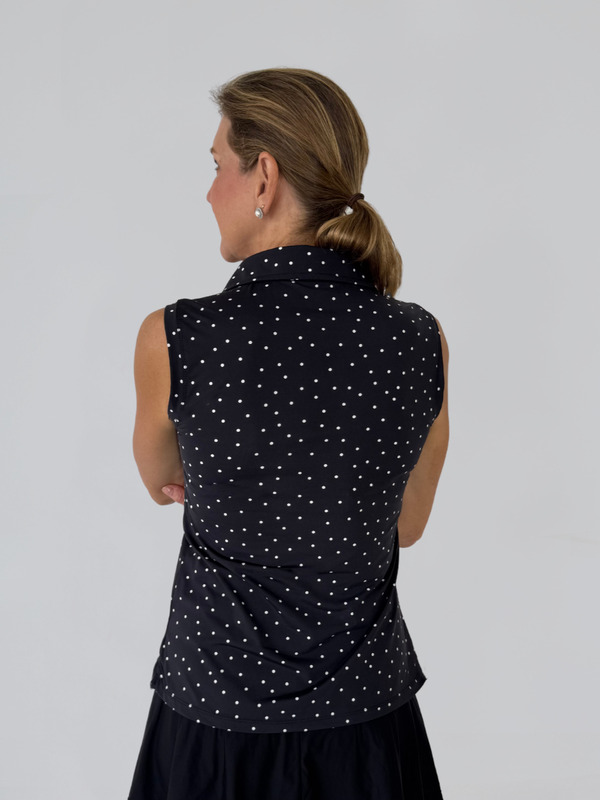 Blusa manga sisa estilo polo en negro con pepas blancas, cuello y sin botones. Confeccionada con ajuste medio a la silueta en tela muy suave y elástica ofreciendo una sensación natural y muy cómoda permitiendo libertad de movimientos. Textil de alto desempeño.