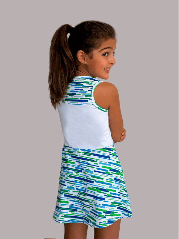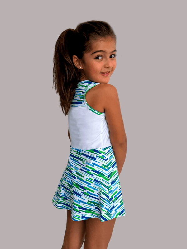 La combinación de colores azul y verde sobre fondo blanco del estampado en formas geométricas es una opción novedosa y atractiva para las niñas. Este conjunto deportivo de 2 piezas compuesto por vestido y short compañero es ideal por su comodidad ofreciendo movilidad para cualquier actividad al aire libre. En la espalda lleva un detalle de el mismo estampado. Textil con propiedades de secado rápido.