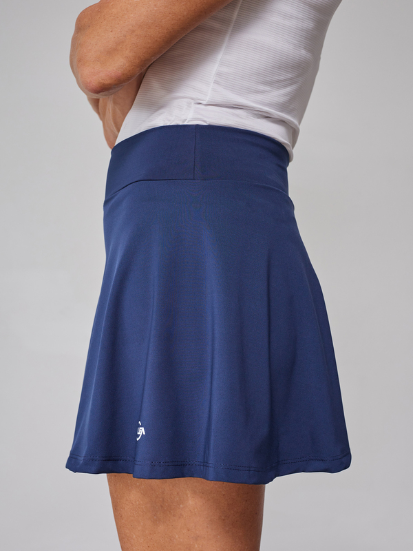 Falda-Short en azul turquí. Prenda cómoda y esencial de pretina media y doble que ofrece un ajuste cómodo en la cintura. La falda suelta con leve vuelo en cadera permite libertad en tus movimientos. Confeccionada con textil transpirable de secado rápido.