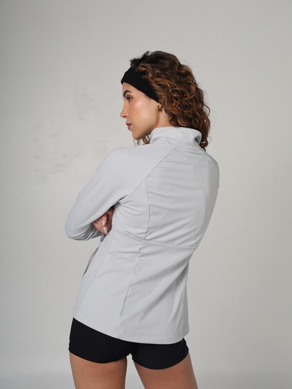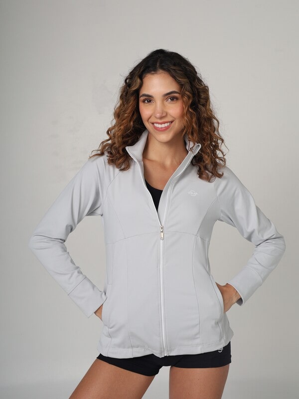 Saco deportivo gris con cuello alto, bolsillos laterales y cierre frontal con puller metálico. Confeccionada en tela suave al tacto y elástica para mayor libertad de movimiento y comodidad. Cortes en la prenda que realzan la figura.