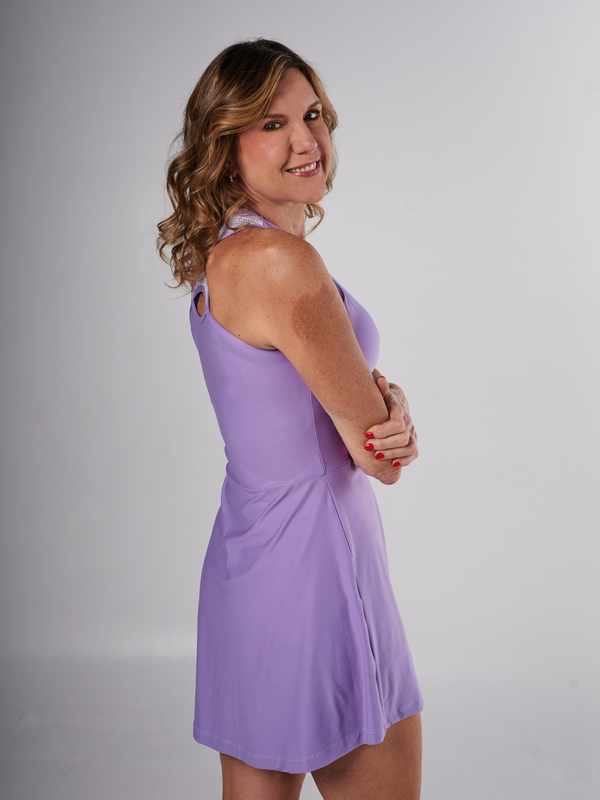 Destaca tu feminidad con el color lavanda o lila, este color marca la diferencia en los vestidos deportivos. El corte slim fit y cuello redondo con corte a la altura de la cintura destacan la silueta y de allí se desprende la falda que ofrece movilidad y comodidad. La espalda descubierta con el detalle de la malla blanca al centro hacen que sea un modelo especial, mientras que el short compañero de pretina alta y ancha ofrecen mayor confort y comodidad en la zona del abdomen. Textiles con atributos funcionales como protección UV, secado rápido y anti manchas de sudor.