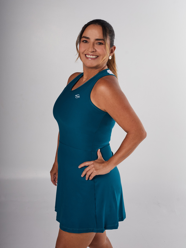Este color azul petróleo marca una diferencia. El diseño slim fit de este vestido deportivo con cuello redondo y el corte a la altura de la cintura destacan tu figura. Falda con algo de vuelo y espalda descubierta con detalle de malla blanca. Incluye como segunda pieza el short compañero de pretina alta y ancha para ofrecer mayor confort y comodidad. Textiles con alto desempeño y atributos funcionales como protección UV, secado rápido y anti manchas de sudor.