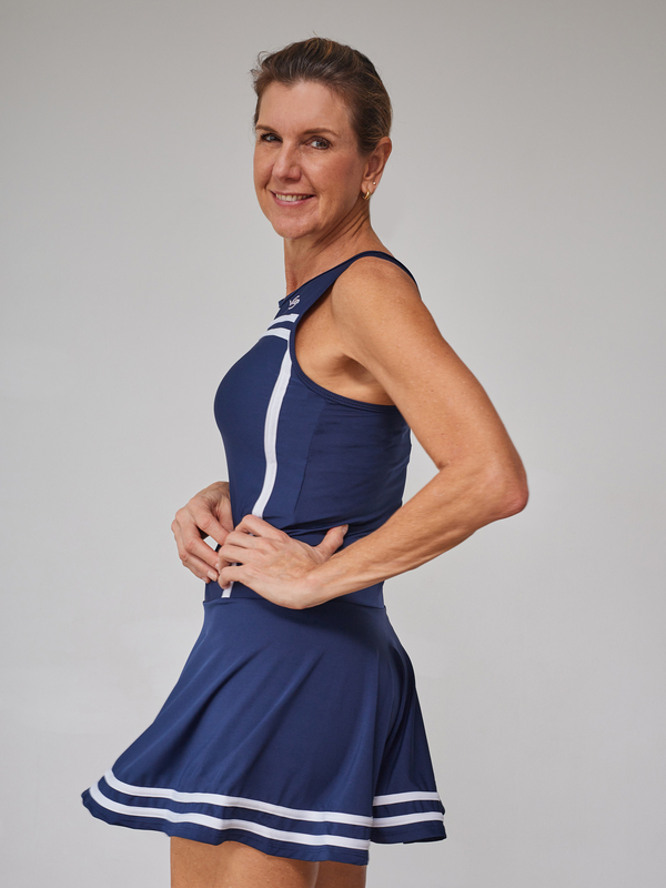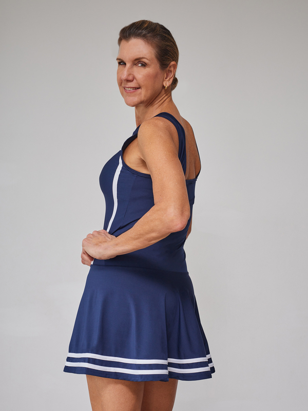 Vestido color azul turquí de corte recto ligeramente ajustado con tirantas que llegan a media espalda. La elegancia y feminidad se refuerzan con las cintas blancas cosidas delicadamente a lo largo del torso en forma vertical. El corte a la altura de la cadera desprende la falda con algo de vuelo, lo que permite libre movimiento y total comodidad. Incluye short por separado de talle alto reforzado en pretina para mayor control.