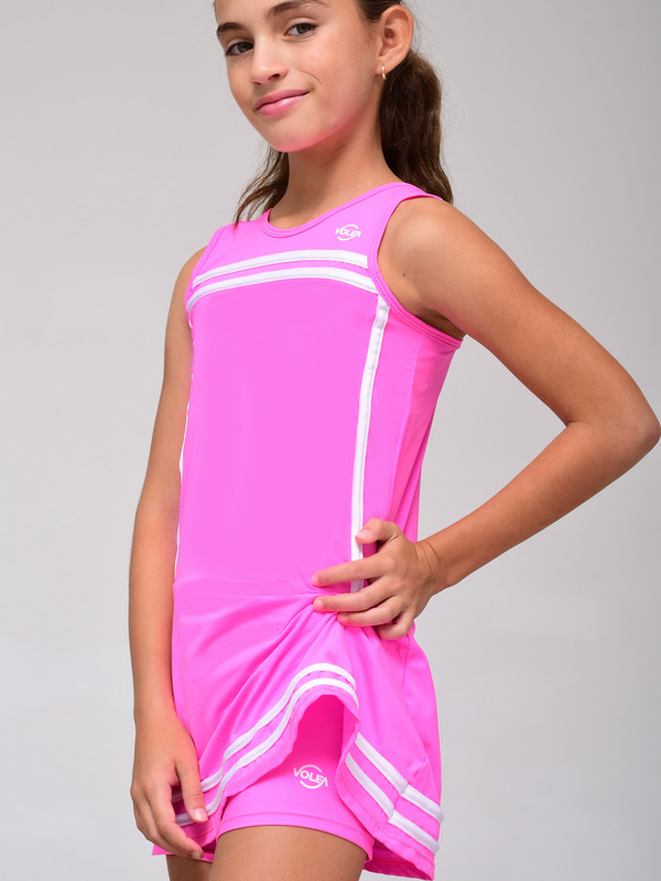 Conjunto deportivo de 2 piezas en color vibrante y lleno de energía. Este vestido color fucsia con las cintas blancas incluye short compañero. Ajuste medio con tirantas anchas hacia la espalda y escotes discretos. Confeccionado en textil suave al tacto ofrece secado rápido y transpirabilidad. Todo pensado en la comodidad y libertad de movimientos para las más pequeñas. También disponible en tallas grandes para adultos.