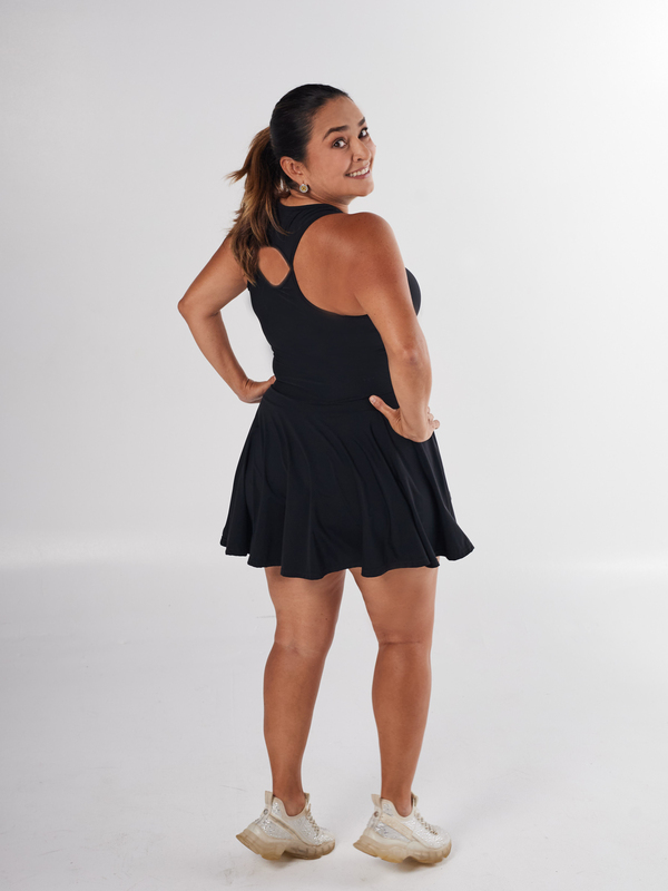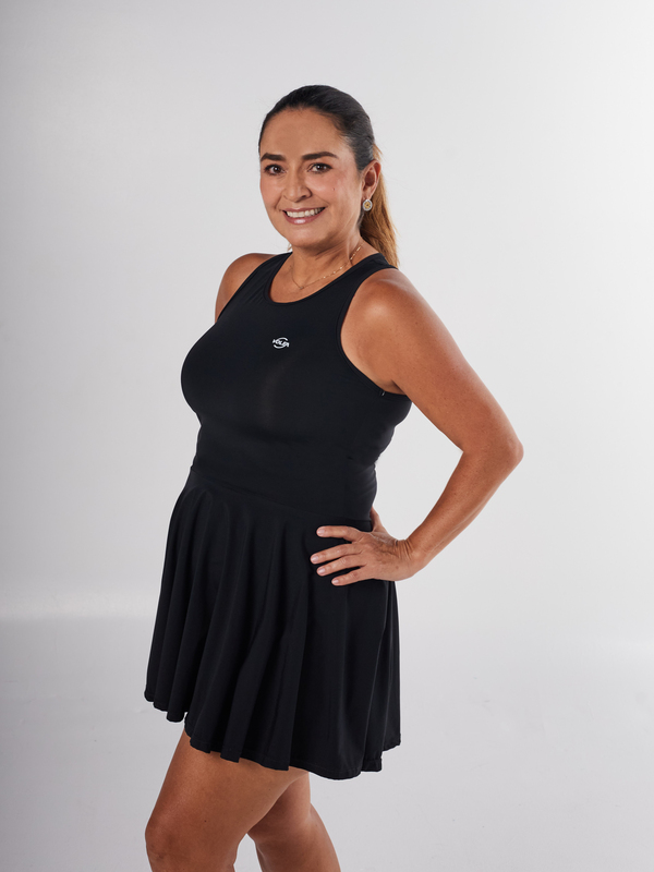 Vestido tradicional en color negro y ceñido en la parte superior y suelto desde la cintura con una falda de vuelo que a la vez te hará ver muy femenina. Hombros descubiertos con detalle especial con corte en espalda. Vestido cómodo apto para todas las figuras. Incluye short por aparte con pretina alta y ancha para mejor confort y control. Textil de alto desempeño con atributos funcionales.